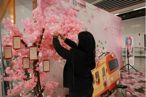 五个站点,五种花语,五重公益心意。五里牌坊站的樱花树间,桃符上写满了“考研上岸”“健康平安”等小小心愿;转山西路站的梨花树前,对诗声此起彼伏,年轻人争相说出“吹面不寒杨柳风”;汉峪金谷站的迎春能量墙上,大家举着桃符写下“我要发光”“向阳而生”;安成街站的海棠市集微景观,随手一拍就是电影感,不少乘客停下脚步;奥体中心站的白玉兰集结台,则是所有集章达人的终点站,领到礼盒的人笑得比春花还灿烂。