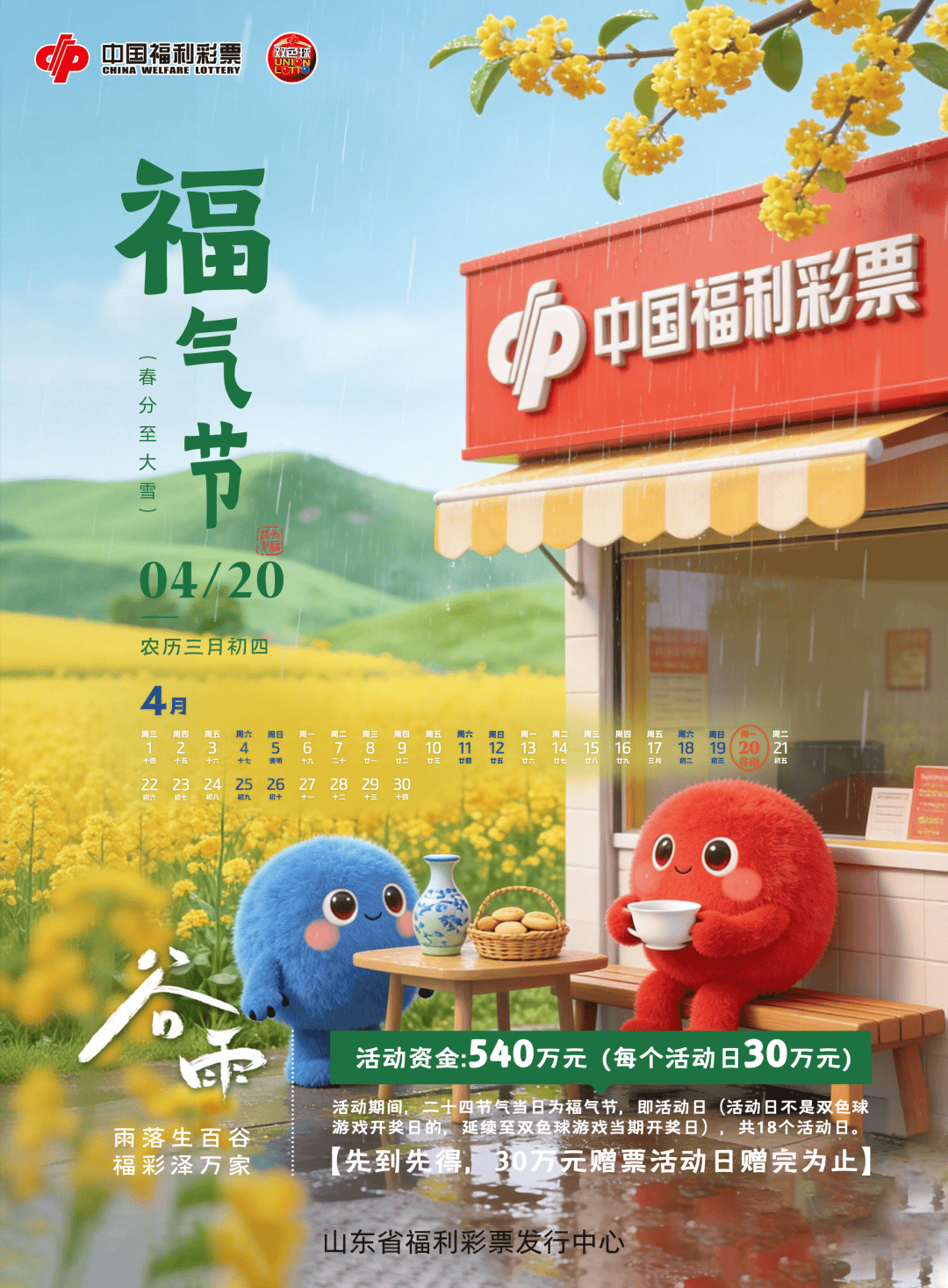 在这美好的时节,山东省福利彩票发行中心为您送上一份“福气大礼”——谷雨“福气节”营销活动明日开启!