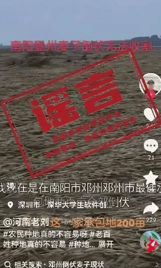 据南阳市互联网举报和辟谣平台,近日,某自媒体平台用户“河南老刘”发布“南阳邓州两百亩小麦倒伏无法收割”相关内容,引发网民关注讨论。经邓州市农业农村部门工作人员实地核查,视频拍摄地点非邓州市境内,网传内容系往年陈旧素材剪辑而成。南阳市镇平县互联网信息办公室依法对账号持有人刘某某进行约谈、批评教育。
