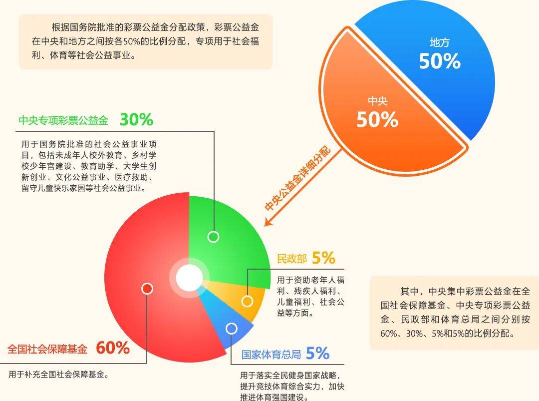 根据国务院批准的彩票公益金分配政策,彩票公益金在中央和地方之间按各50%的比例分配,专项用于社会福利、体育等社会公益事业。其中,中央集中彩票公益金在全国社会保障基金、中央专项彩票公益金、民政部和体育总局之间分别按60%、30%、5%和5%的比例分配。